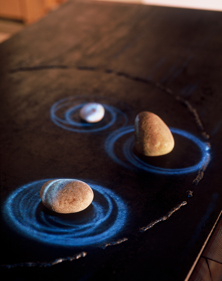 Project Overview When retailer Syd Beder opened Lileo, his new fashion athletic wear store in Toronto, he was looking for a compelling experience that would reinforce Lileo’s brand while drawing customers into the store. The Lileo Light Fountain was created in response to his desire for something truly unique. Three stones sit on a large black steel surface near the store’s entrance. Ethereal wisps of light play along the curved surface, circling the stones in constantly changing patterns. When customers move a stone or place their hands on the surface, the swirling light wisps respond by seeking out orbits around and among the new positions of stones and hands. |