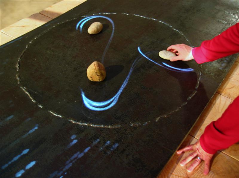 The technical heart of the Lileo Light Fountain is a computer with sophisticated vision tracking software that detects and monitors the position of objects on the steel surface. The light whisps, projected using an LCD data projector, are then directed to move towards the stones using mathematical algorithms derived from planetary and fluid motion. The software is written in C++ and Java. The high-gain camera used for sensing features a special lens and infra-red filter to better detect the physical objects among the projected imagery. An LED infra-red illuminator and automatic calibration software enable consistent vision sensing under the changing ambient lighting conditions of the store. By mounting the projector, camera, and infra-red illuminator on the ceiling, we separated the delicate technology from the physical wear that results from constant handling. Because there is no visible technology, people feel comfortable with the interaction: the fountain is perceived as a material object rather than a technological device, and there is no apprehension about breaking the system or pressing the wrong button. By many measures, the Lileo Light Fountain has truly succeeded in creating a unique, compelling experience. Loved by the client and the customers, it brings a bit of magic to Lileo. |