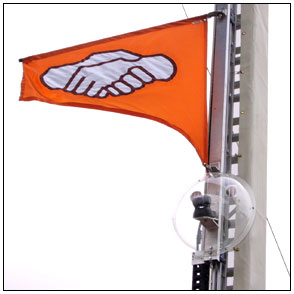 The Power of Holding Hands is an interactive flagpole, activated by participants joining hands. Attached to the flag is a robotic camera, offering a view that changes as the flag rises, from a close-up of the participants to an overview of the entire party. As long as the chain of hands remains connected, the flag stays raised and the camera pans and zooms around the party, providing a virtual tour of the attractions.