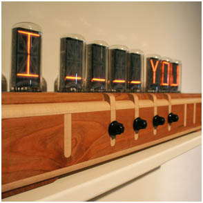 The vintage radio knobs invite viewers to interact with this hand crafted maple and cherry work. The four letters they select are displayed on vintage Nixie tubes: a message to a loved one, perhaps, or simply a fanciful thought.