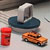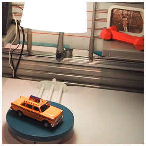 Five playful physical objects are gathered on the desk's integrated bookshelf. Each object has a unique clip associated with it, which plays on a nearby monitor when the object is placed on a specially designed pedestal on the desk surface.