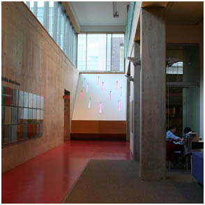 Inset into an angled wall at the end of a long corridor are eleven tall channels, glowing with light from within. As people ascend and descend the staircase opposite the piece, their movements are reflected in rippling white light that flows up and down through the channels.