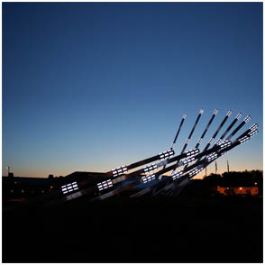 Twelve tall shafts rise at angles from a roadside hilltop. Using simple web-based controls, members of the community compose wave-based patterns that flow across pulsing lights that are spaced along the shafts. At dusk, Solar Collector comes to life with the patterns created that day.